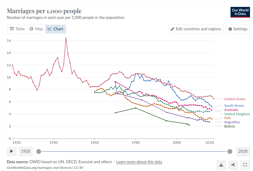 There is also another difference, in that human quality have severely decreased over the years. Technology and science might have advanced exponentially in this time, but human quality and intelligence have considerably lowered. People are more greedy, ignorant, arrogant, less willing to help each other, more devoid of the instinct of responsibility towards the community, more selfish etc, all fueled up by a multitude of factors. This situation has created more people that unavoidably ended up divorced because they couldn’t maintain a marriage where naturally the two sides have to cooperate, co-exist, help and understand each other, sacrificing for each other etc., once normal values that the individual people on a generalized scale are being more and more depleted of. Due to the above and other factors, statistically as one example there has been a decline of marriage (and implicitly divorce) rates over the last century in some of the larger economies in the world [2], meaning that even though the population is a few times larger than it was back then, a lot less people are marrying.