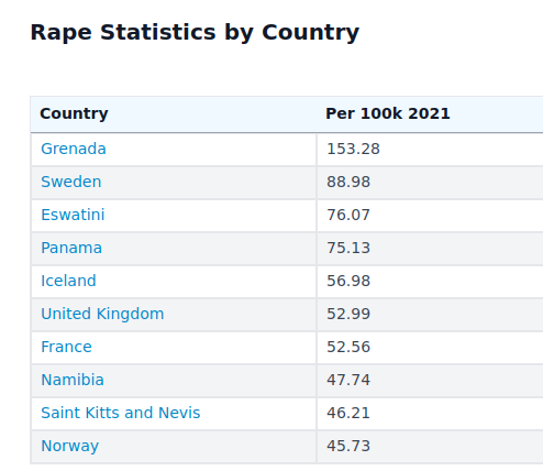 rape rates which are observed in a 2021 top where Sweden, Norway, France and United Kingdom appeared in top 10 countries in the