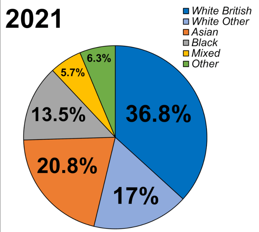 Further, London is undoubtedly one of the most dangerous capitals in the West and likely the entire world. Incidence of knife offenses and other forms of criminality increased exponentially over time. What also increased exponentially in the percentage of non-White population in London, from 2.3% in 1961 to 46.2% in 2021 [3].