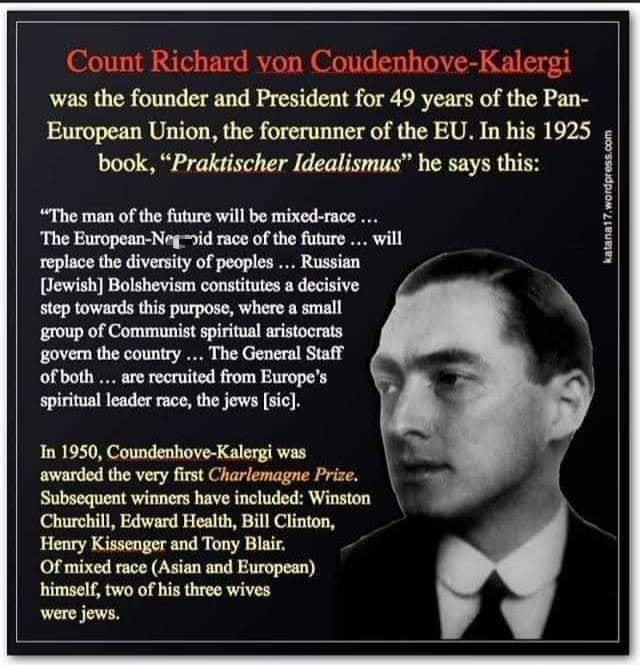 It is therefore mostly certain that Richard Kalergi did envision a future of Europe where the native population will be a “hybrid” race of Whites, Asians and Blacks, and he expressed his views in his book. He also considers the Jews to be the intellectual master-race of Europe. It is uncertain whether Richard Kalergi is Jewish himself or not (from the father side), however it is true that he had been married three times, out of which two wives were Jewish. However in the end this is less relevant. What is the most important is that, indeed, according to his book, the quote is true, which validates its authenticity and debunks the so-called “conspiracy theory” claims, and that the Jews are for the most part those behind the execution of Kalergi’s ideals of the future Europe.
